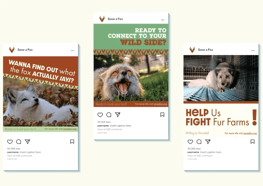 This was a university project done with my choice of client. Save a Fox is a nonprofit organization based in Lakeville, Minnesota that specializes in rescuing foxes from fur farms, pet surrenders, and illegal ownership situations. The brand of this organization is notable for its whimsical and authentic voice focused around creating a community of people dedicated to supporting animals in need.