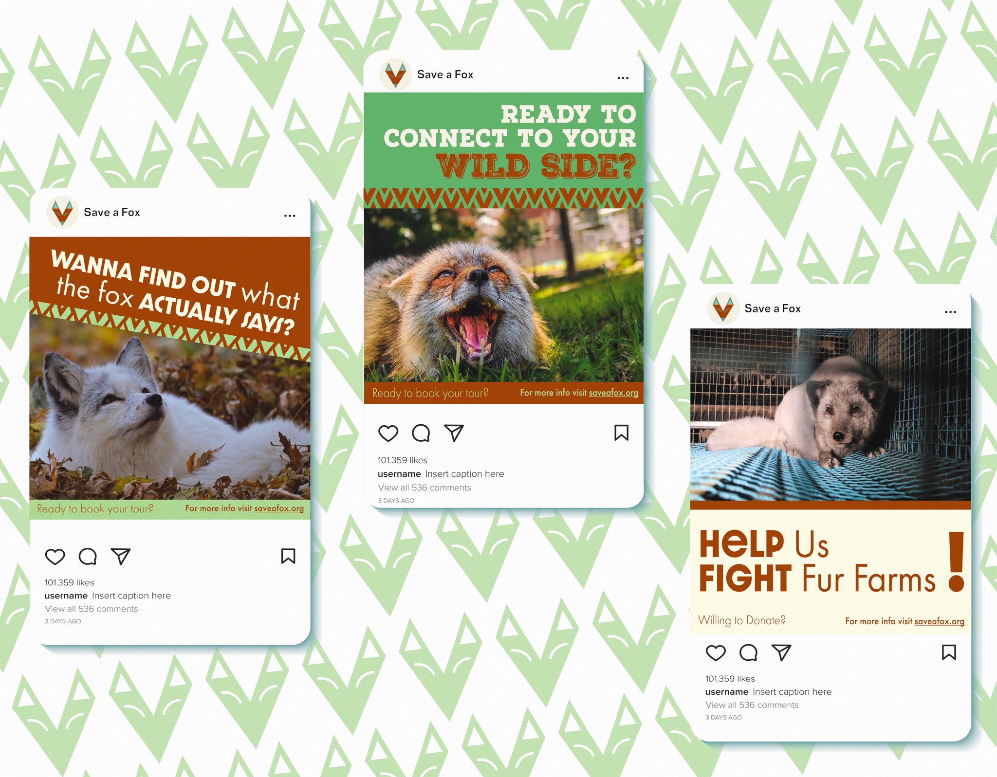 save a fox is a nonprofit organization based in lakeville, minnesota that specializes in rescuing foxes from fur farms, pet surrenders, and illegal ownership situations. the brand of this organization is notable for its whimsical and authentic voice focused around creating a community of people dedicated to supporting animals in need. this was a university project done with my choice of client.